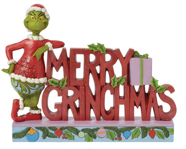 This colorful sign from Jim Shore wishes you a Merry Grinchmas with rosemale and mistletoe. On a stage of garland and ornaments The Grinch poses wi...