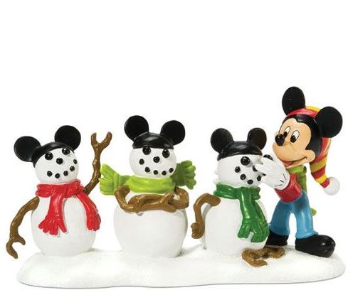 This hand-painted resin accessory is classic Mickey – dressed in a striped stocking cap and neck scarf, Mickey is putting the final touches on his three snowmen. Instead of a tall silk hat each snowman dons the iconic Mickey's Ears hat.