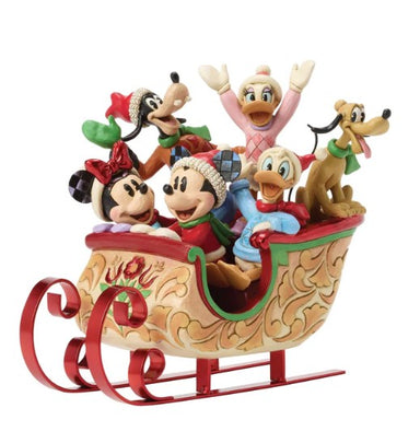 In this festive Jim Shore scene, Mickey and Minnie Mouse don Santa suits adorned with intricate rosemaling patterns and joyfully carry candy canes....