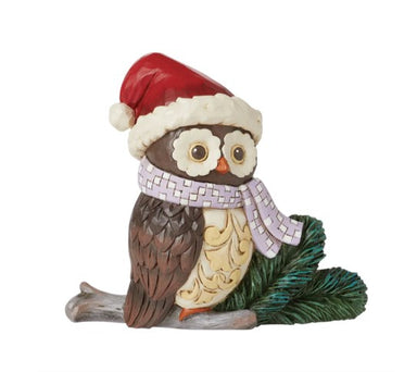 This miniature owl figurine wears a patchwork blue scarf with a Santa hat. With wide eyes and sweet expression, the little owl perches near pine ne...