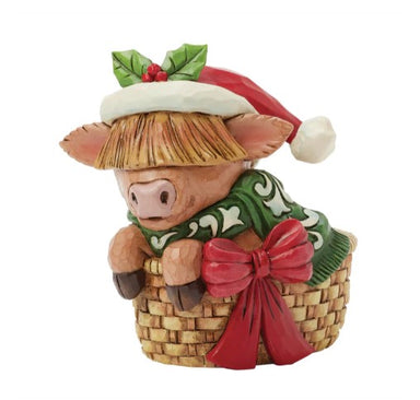 This adorable Jim Shore highland cow miniature radiates holiday cheer from within a cozy basket adorned with a festive bow. Dressed in a cheerful s...