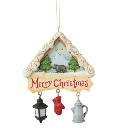 This Christmas at the Lodge delightful Jim Shore ornament captures a cozy cabin roof framing a scene of a bear walking amidst a backdrop of trees a...