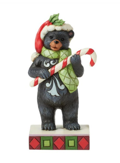 This playful Christmas at the Lodge Jim Shore black bear wears a festive Santa hat adorned with holly, he wears a festive scarf and holds a candy c...