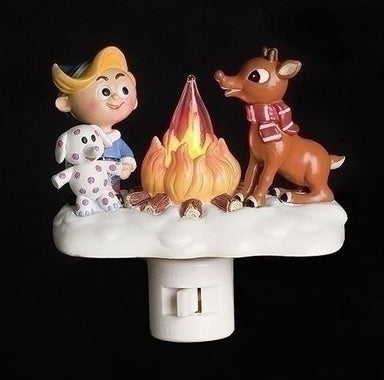 4.5"H RUDOLPH CAMPFIRE NIGHT LIGHT W/ELF & TOY FLICKER BULBMaterials: RESINDimensions: 4.5"H 4.25"W 3.5"DPower Type: PLUG-IN