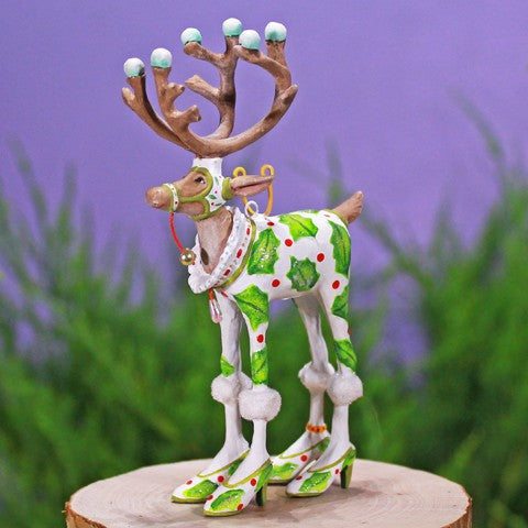 The jazzy Patience Brewster Dash Away Vixen Reindeer Ornament features Vixen, who likes a bit of glam for the holidays in her vines and berries, ruffles, beads, feathers, and, of course, matching high heels.
