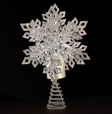 12"H LED TRICOLOR SILVER SNOW-FLAKE TREETOP; BATT N/INC; TIMER Materials: METAL Dimensions: 12"H 9"W Power Type: 3 AA BATTERIES not included.