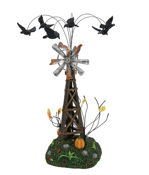 A murder of crows circles the dead, worn carcass of a weathervane no longer able to pump water.