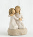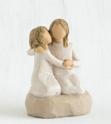- Figure of two girls in cream dresses, kneeling next to each other on a pad. One older, one younger, with arms around each other