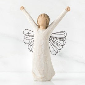 Bringing a triumphant spirit, inspiration and courage. 6”h hand-painted resin figure with wire wings Standing angel in cream dress with wire wings...