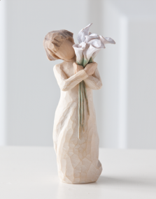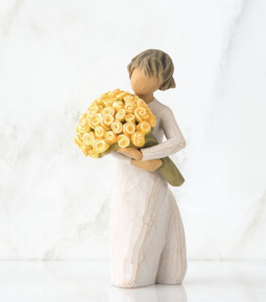 Wishing you sunny days of happiness. 5.5”h hand-painted resin figure Standing figure in cream dress, holding large bouquet of yellow roses in her ...