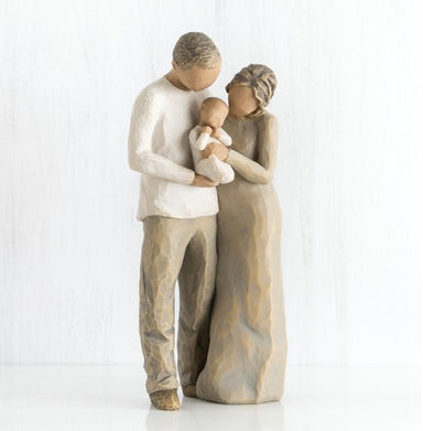 8.5”h hand-painted resin figure Figure of couple standing next to each other, holding a baby between them. Woman, man and baby have darker skin to...