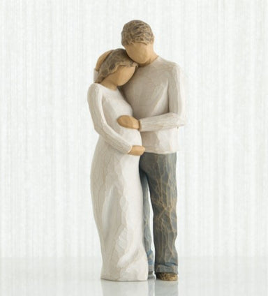 8.5”h hand-painted resin figure Figure of standing man and pregnant woman embracing. Woman in cream dress, man in cream shirt and blue jeans Packa...
