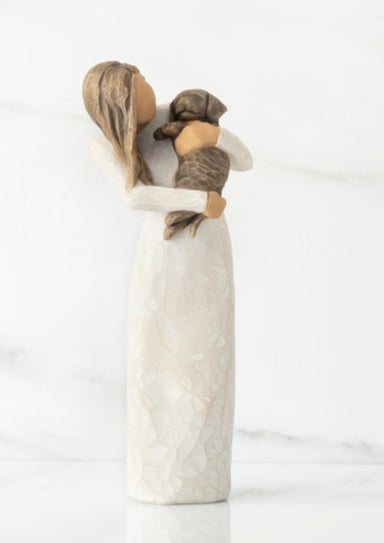 7.5"h hand-painted resin figure Standing figure in cream dress, holding dark color puppy in her arms Packaging box includes enclosure card for gif...