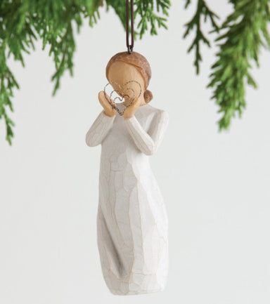 Memories... hold each one safely in your heart 4.5”h hand-painted resin ornament with wire wings. Brown elastic cord for hanging