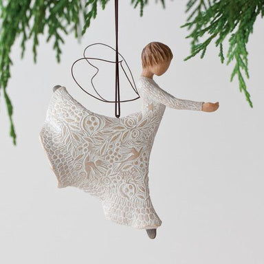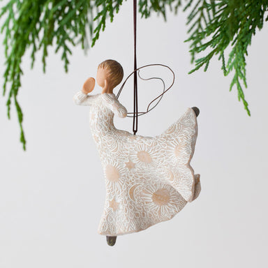 Singing... Soaring! All in universal harmony 5”h hand-painted resin ornament with wire wings. Brown elastic cord for hanging