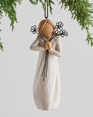 Friendship is the sweetest gift! 4”h hand-painted resin ornament with wire flower accent. Brown elastic cord for hanging