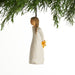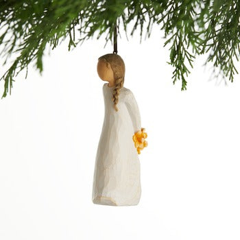 4.25”h hand-painted resin ornament. Brown elastic cord for hanging