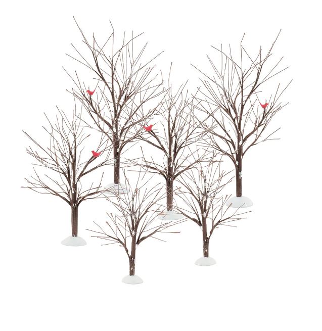 A touch of frost and several brightly colored birds add to this bendable set of trees. Shape them to fit any display. Use Department 56 Cross Product accessories to enhance your Village display. 12, 9.5, 7.5''