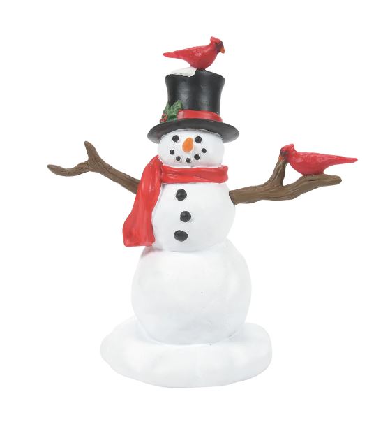These cheery red cardinals could not resist the broad smile on the hand painted snowman standing tall and proud in the front yard. The piece measures 3" tall and is hand painted .