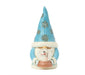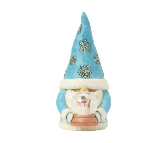 This Jim Shore Christmas gnome delights with winter wonder in a snowflake-patterned hat. He carries a charming glass dry snow globe of a miniature snowman scene that captures the magic of the season, adding a whimsical and cozy touch to your holiday