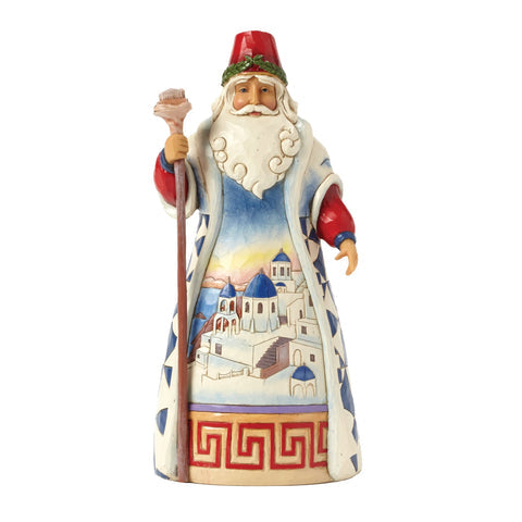 Part of the Santas Around the World collection, Father Christmas travels to the land of Greece. He holds a staff featuring the Parthenon while displaying a quaint scene of the Santorini coast.