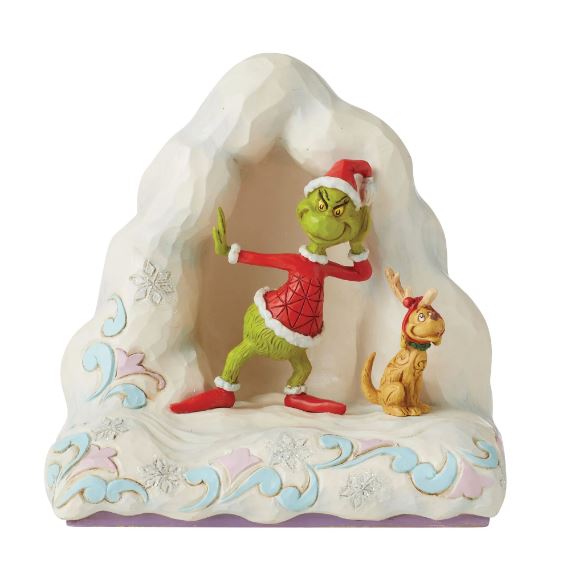 Leaving his cave for the first time in months, The Grinch dresses as Santa to descend his hermit mountain with his dog Max. This stunning Jim Shore figurine brings the pair to life as the partners in crime sneak into town to steal Christmas joy.