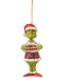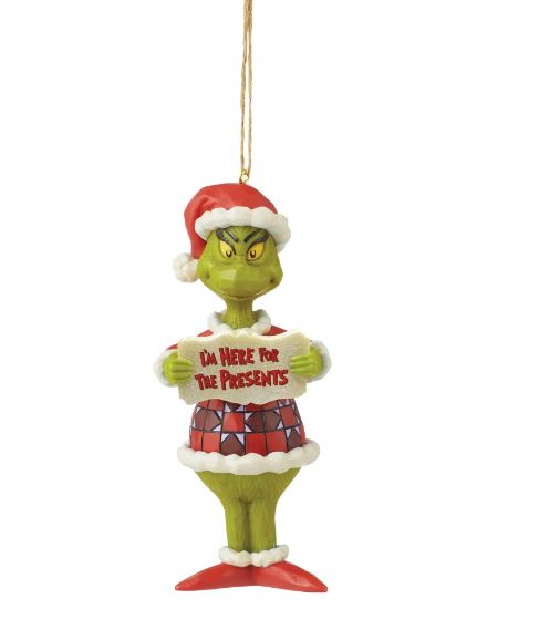 This charming Jim Shore ornament brings a message. Delivered by everyone's favorite Christmas curmudgeon, The Grinch wears a Santa hat and plots from your tree's branches. Holding a sign, he declares that he's only here for the presents!