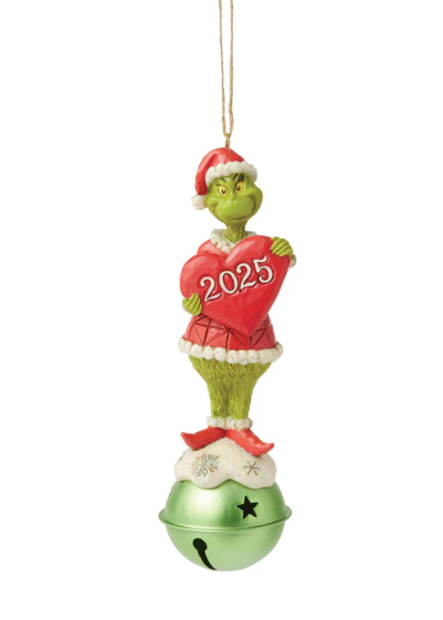 Perched atop a gleaming jingle bell, the Grinch grins in his Santa suit, holding a heart marked with the year 2025. This festive Jim Shore ornament reminds us to live in the moment and create holiday moments worth remembering for years to come.