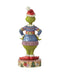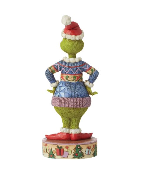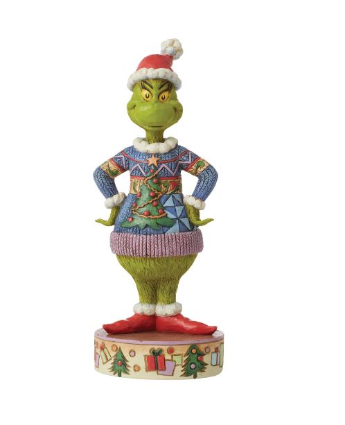 Standing with confidence, this Grinch designed by Jim Shore boasts an ugly sweater and festive stage. Wearing a Santa hat and shoes, the Grinch smiles with style. His busy Christmas sweater features a holiday tree, lights and chaotic pattern.