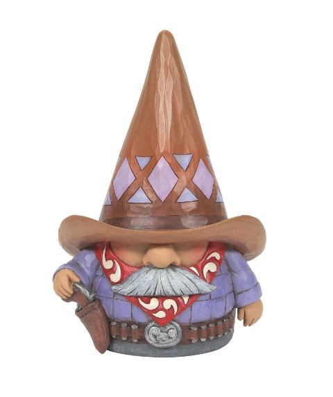 No one knows gnomes like Jim Shore! With a red handkerchief and cowboy hat, this mustached garden guardian is gnome on the range. Wearing a belt of bullets and a sheathed pistol, this western inspired gnome is ready for whatever the day brings.