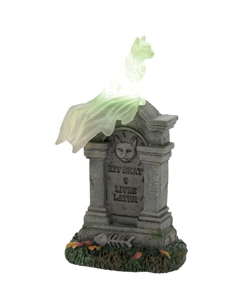 Embarking on her 10th life, Kit Ekat ponders momentarily atop her tombstone before pouncing off to eternity.