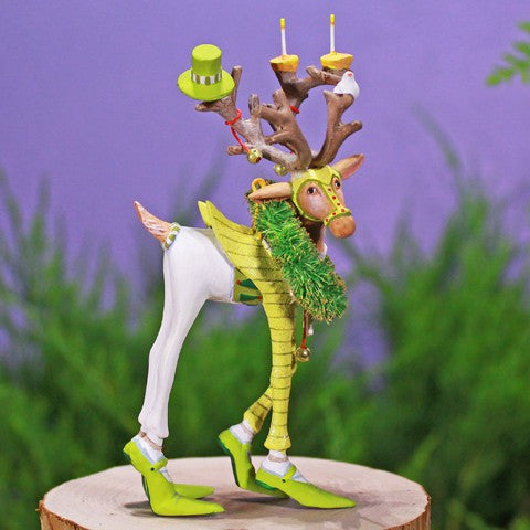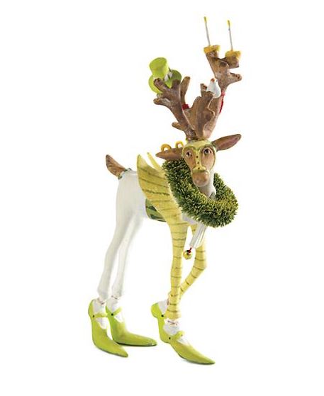 Our Patience Brewster Dash Away Prancer Reindeer Ornament is a collectible item with intricate detail. He sports a sisal wreath, top hat, and festive suit.