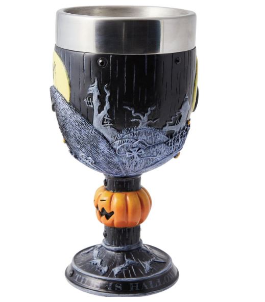 Raise your Goblet to the Pumpkin King this Halloween with this Disney Showcase Collection Chalice featuring the iconic nightmare hilltop with a moonlit Sally & Jack. Stainless steel insert for easy hand washing. Hand painted and decorated with faux gems.