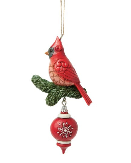 This exquisite Jim Shore Nordic Noel ornament showcases a beautiful cardinal perched gracefully on a monochrome pine sprig, embodying the essence of winter. Below the branch, a snowflake-patterned ornament adds festive charm.
