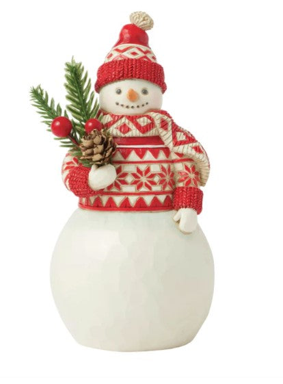 This cheerful Jim Shore Nordic Noel snowman is dressed in an intricately patterned red Nordic sweater, scarf, and hat, radiating warmth and holiday spirit. With a bright smile, he holds a fresh evergreen sprig in his hands, eagerly embracing the joys of