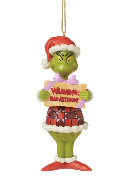 These Jim Shore modeled hanging Christmas ornaments feature The Grinch holding a present with sarcastic and snarky messages. Wearing a patchwork Santa suit and hat, The Grinch smirks with holiday humor and inspired spirit.