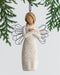 4.5”h hand-painted resin ornament with wire wings. Brown elastic cord for hanging