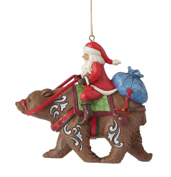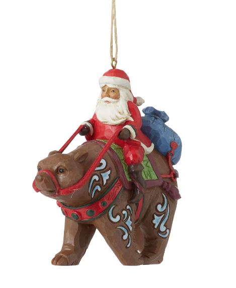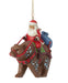 Santa doesn't always travel by reindeer led sled. Sometimes he calls upon other friends of the forest to get him across heavier terrains. Steering a hefty brown bear through the woods, Santa sits a top the massive creature in this charming ornament.