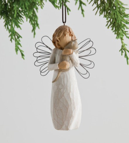 • Angel in cream dress with wire wings, holding gray cat in arms. Hook and loop affixed to figure's head