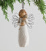 • 4.5”h hand-painted resin ornament with wire wings. Brown elastic cord for hanging