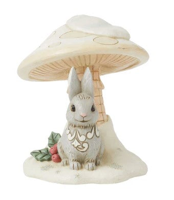 This tiny bunny from Jim Shore shares a scene of wintertime wonder in the White Woodland. With rosemaling fur and rosy cheeks, this darling bunny seeks shelter from the snow under a patchwork patterned mushroom cap. Snowflakes sparkle at her feet.