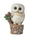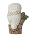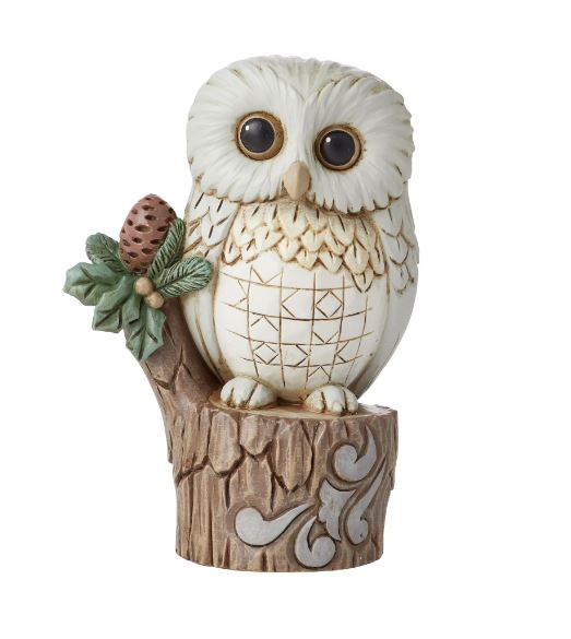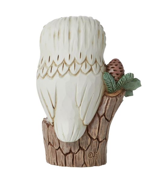 Jim Shore's White Woodland collection celebrates friends of the forest and the beauty of nature in wintertime. Eyes wide with delight and wonder, this little owl perches upon a tree stump with patchwork feathers and pine cone details.
